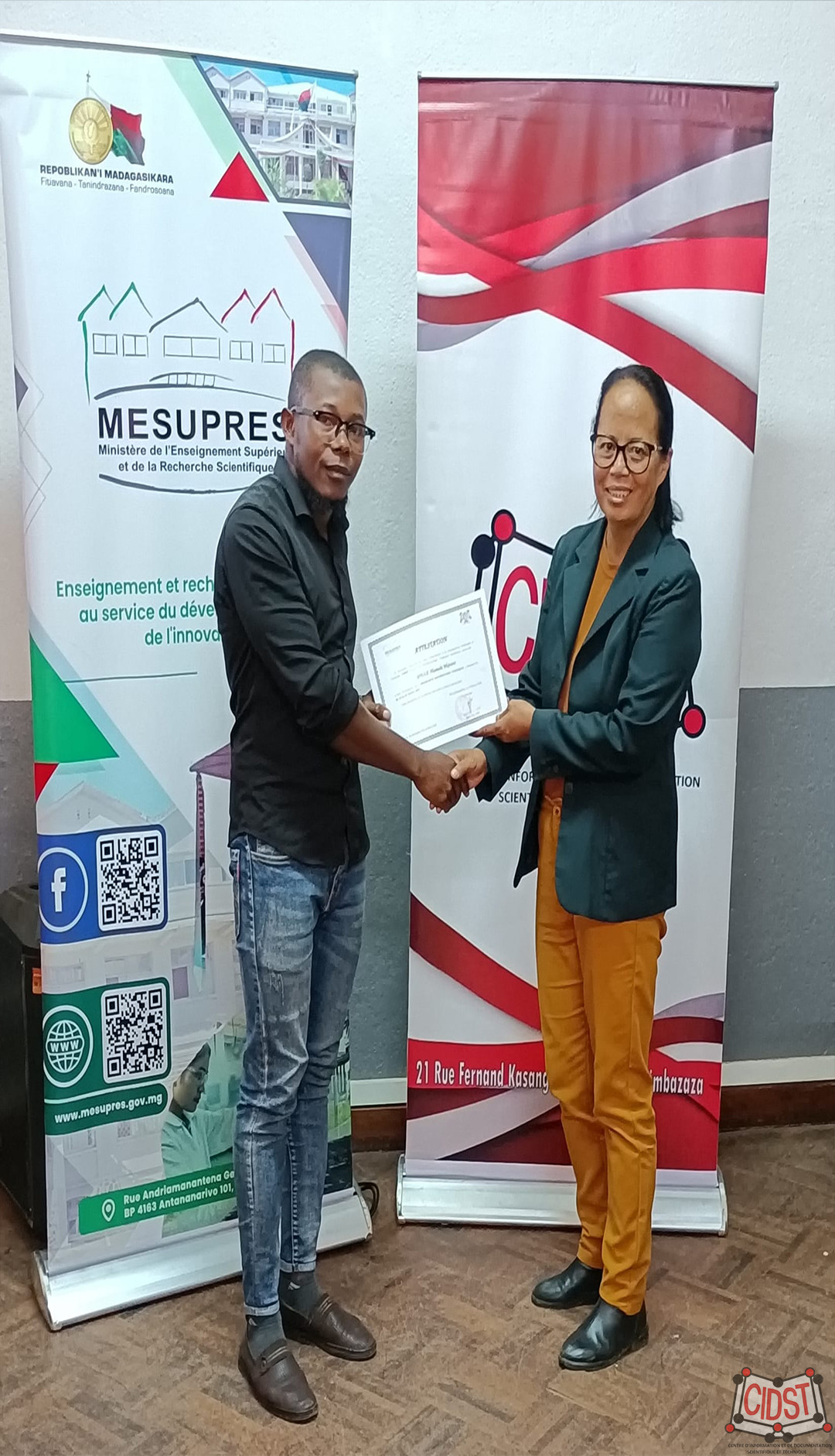 Ce jeudi 26 fรฉvrier 2026, le CIDST a cรฉlรฉbrรฉ la clรดture de 3 jours de formation intensive avec la remise solennelle des attestations de fin de formation ร l’ensemble des participants. Un moment fort et bien mรฉritรฉ !